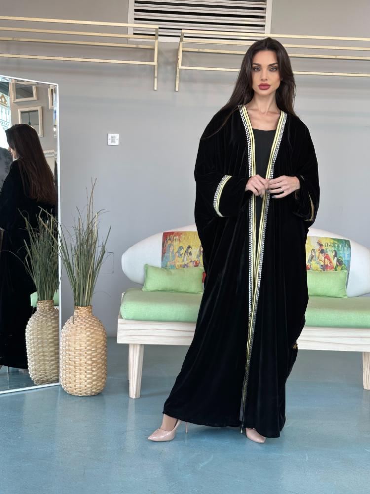 Hoodie Winter Bisht “Hemp blue with bronze velvet lining beaded front & on hand”