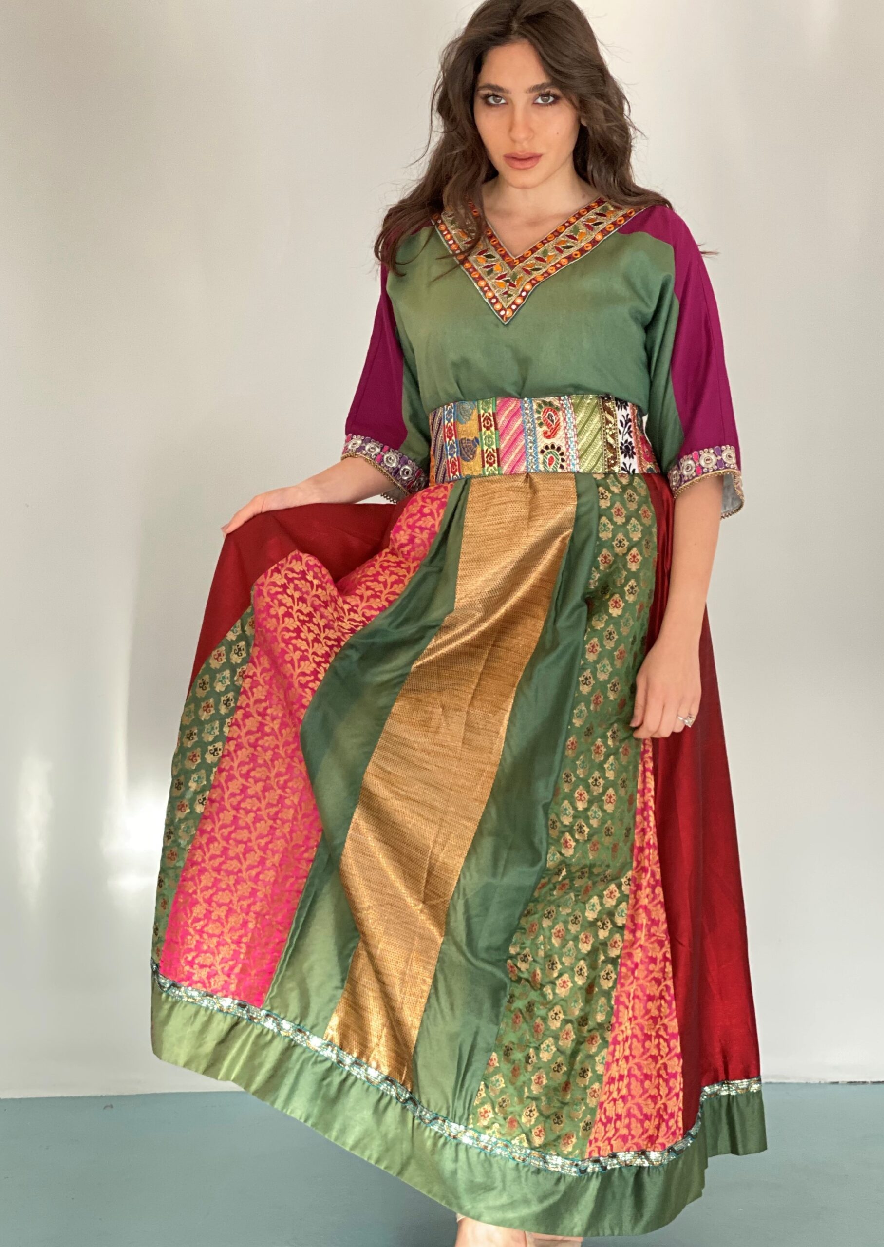 Tail dress Crepe gold & gray with belt