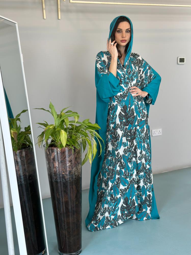 Embroi Abaya, Aqua marine crepe with big pearl botton