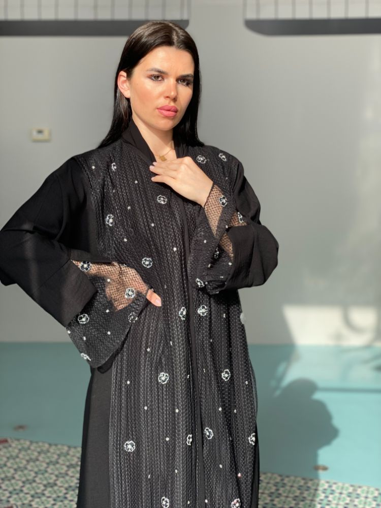 Printed Abaya, “neon yellow linen with white piece on hand & front”