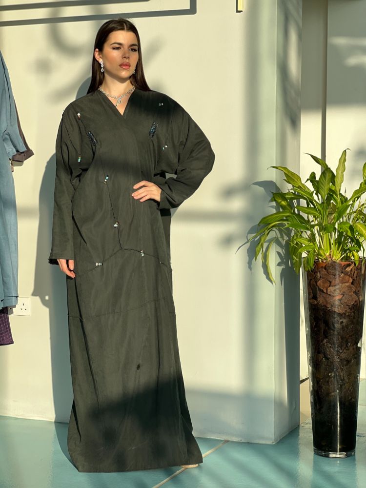 Embroi Abaya, Aqua marine crepe with big pearl botton