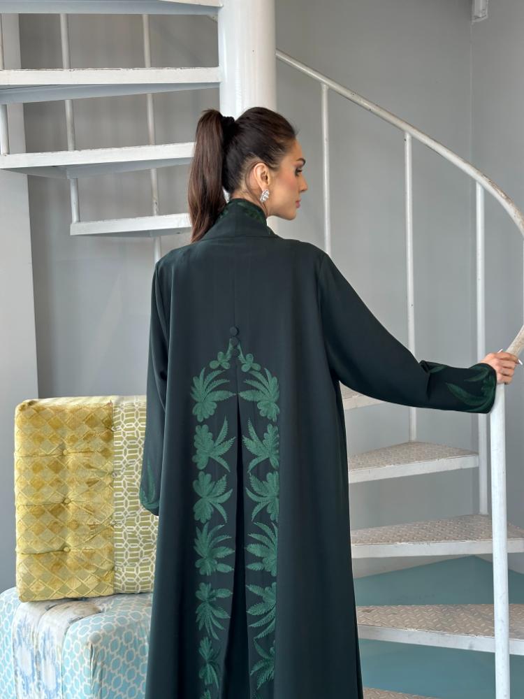 Colored Abaya, “A line style glossy blue with black crepe materials”